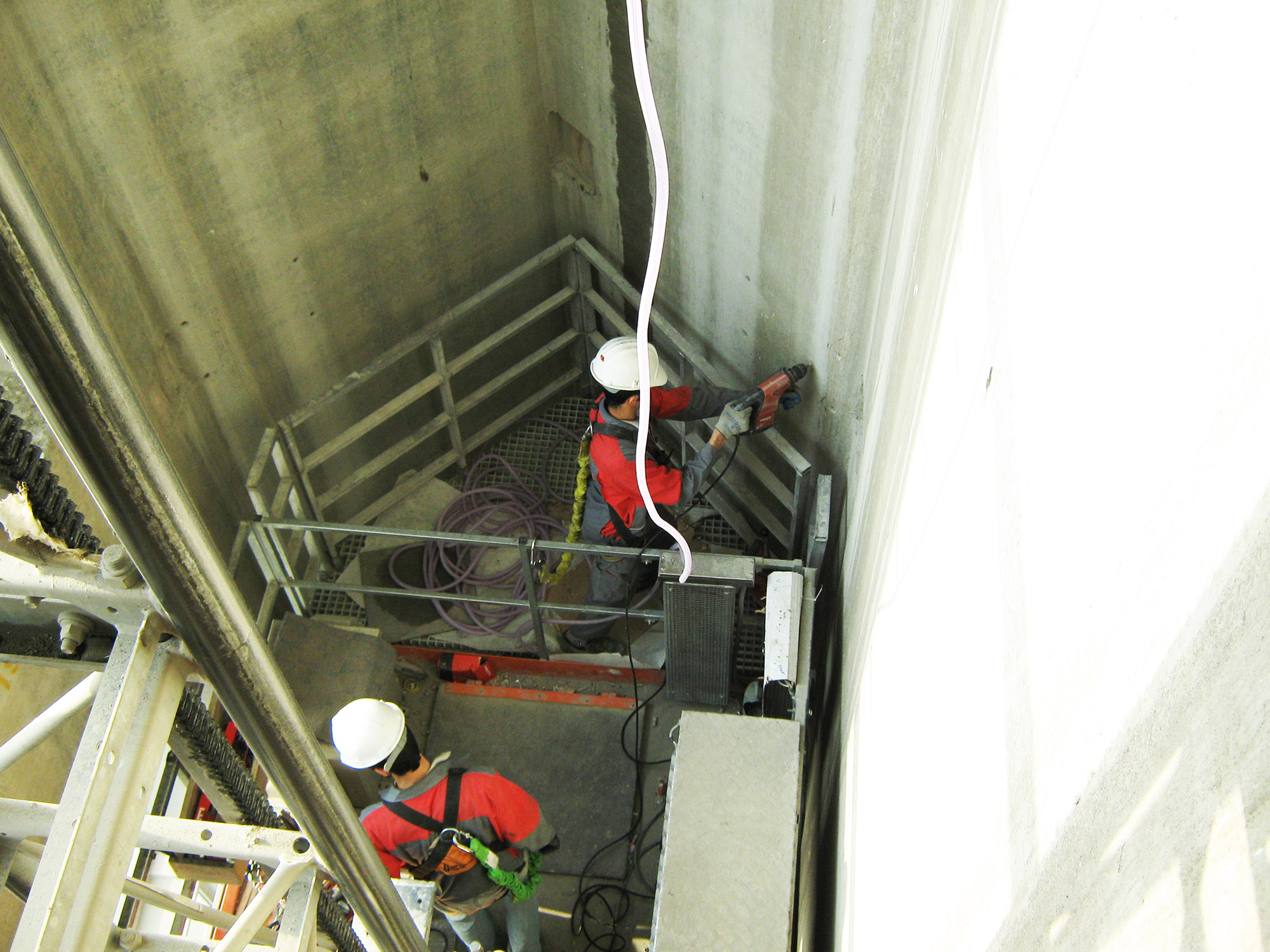Due to the lack of engine room space at the top of the tower, the machine room of 2 elevators with a capacity of 1050 kg in the top of the structure is located at the lowest point of the shaft.